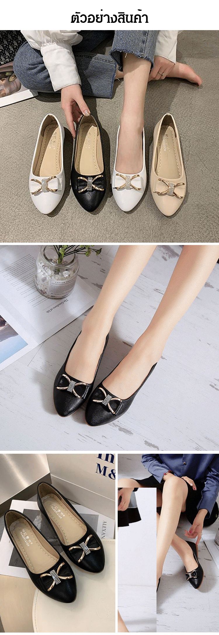 วัสดุหนังวัว พื้นรองเท้าแบน เดินไม่เมื่อย ไม่กัดเท้า ดีไซน์ติดโบว์ สวยงามลดอายุ